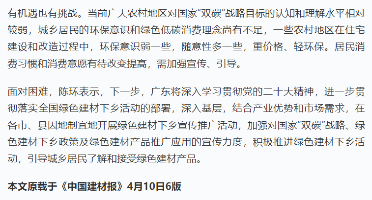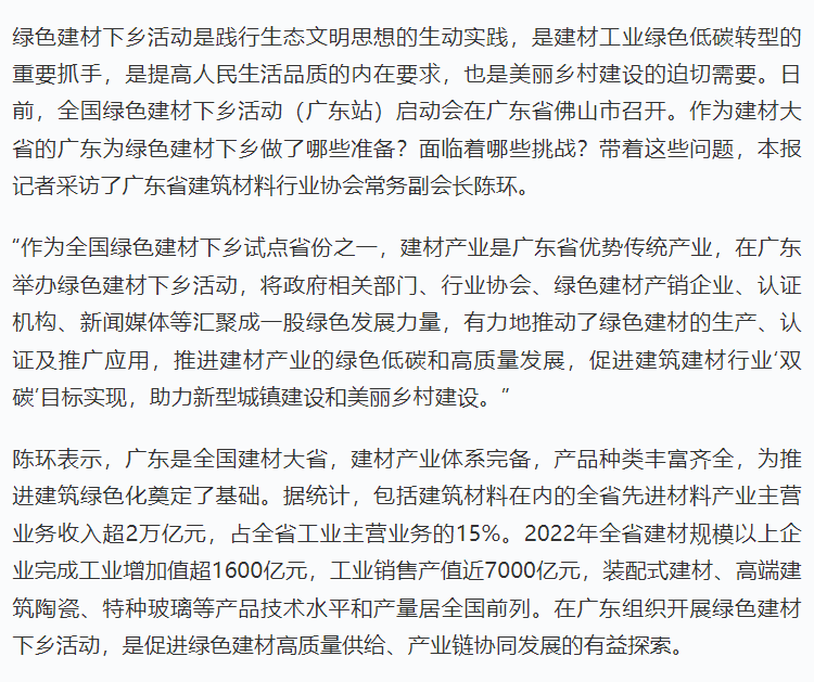 日前,省建材行业协会常务副会长陈环接受中国建材报记者采访,结合绿色建材下乡活动,谈我省建材产业绿色低碳和高质量发展,助推乡村振兴。