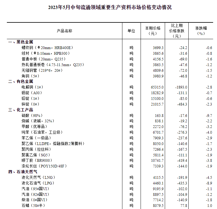 5月24日,国家统计局发布的对全国流通领域9大类50种重要生产资料市场价格的监测情况显示,2023年5月中旬与5月上旬相比,8种产品价格上涨,41种下降,1种持平。其中,包括普通硅酸盐水泥(P.O 42.5袋装)、普通硅酸盐水泥(P.O 42.5散装)及浮法平板玻璃(4.8/5mm)3种非金属建材价格情况。