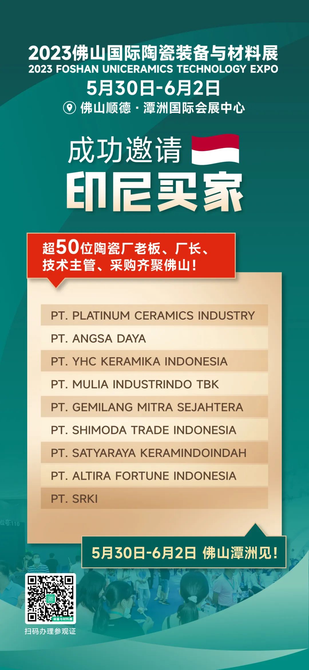 本届展会举办时间为5月30日-6月2日,地点为佛山潭洲国际会展中心。500+海内外上游企业,100+矿山原料企业,意大利、西班牙等海外龙头企业——西斯特姆、萨克米、西蒂贝恩特、天工法拉利、AIRPOWER、POPPI、DIGITAL CERAMIC、赛尔、西门子、司马化工、SMAC、TECNOGRAFICA、STYLGRAPH、INKSIDE、NITIDA、PROJECTA、SICER、SMALTOCHIMIC、EGO DESIGN、MASS、MECTILES等,与国内领军企业科达、力泰、新景泰、希望、美嘉、中鹏、金刚、道氏、康立泰、扬子、磐盛、迈瑞思、汇川技术、星光传动等将一同亮相,展示覆盖陶瓷制造全产业链最全面、最前沿的新技术、新工艺、新设备。除印尼外,越南将近40家陶企也将组团看展。而印度、伊朗、巴基斯坦、孟加拉、土耳其、沙特阿拉伯、阿联酋、阿尔及利亚、埃及、巴西、波兰、俄罗斯、韩国、马来西亚、墨西哥、尼日尼亚、日本、斯里兰卡、泰国、乌兹别克斯坦以及德国、英国、日本、瑞士、美国等陶瓷产区也将组团。