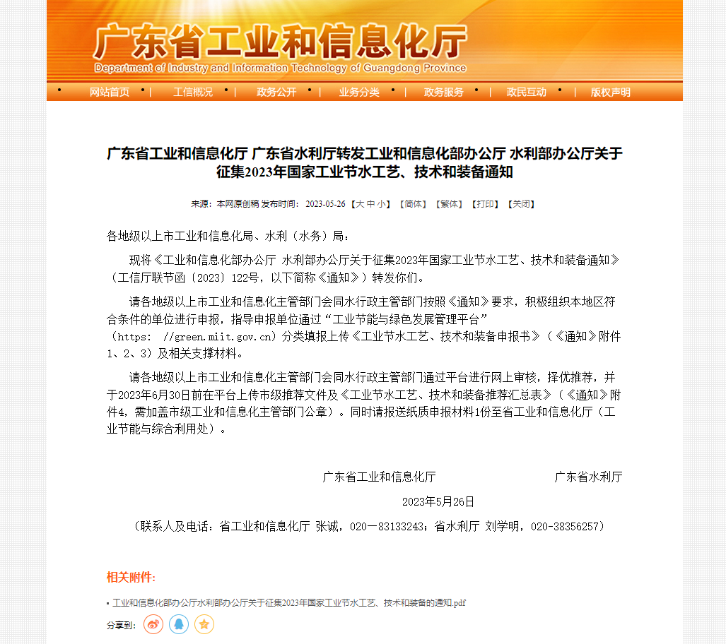 日前,广东省工业和信息化厅、广东省水利厅转发工业和信息化部办公厅、水利部办公厅关于征集2023年国家工业节水工艺、技术和装备通知,请相关单位按要求申报。