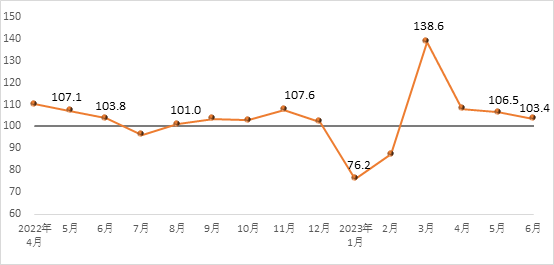 2023年6月份建筑材料工业景气指数为103.4点,比上月回落3.1点,高于临界点,处于景气区间,建筑材料工业运行继续保持恢复态势。