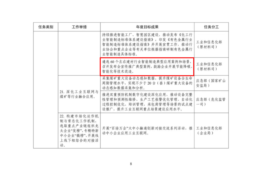 工信部近日印发《工业互联网专项工作组2023年工作计划》(以下简称《计划》)。《计划》提出,制定实施“5G+工业互联网”512升级版工作方案。推动不少于3000家企业建设5G工厂,建成不少于300家5G工厂,打造30个试点标杆,发布首批5G工厂名录,编制典型案例集。完善“5G+工业互联网”发展管理平台,落实5G工厂入库,持续跟踪项目进展情况。《计划》还提出,遴选60个左右建材行业智能制造典型应用案例和场景,召开发布会宣传推广典型案例,鼓励企业开展节能降碳、智能化等技术改造。