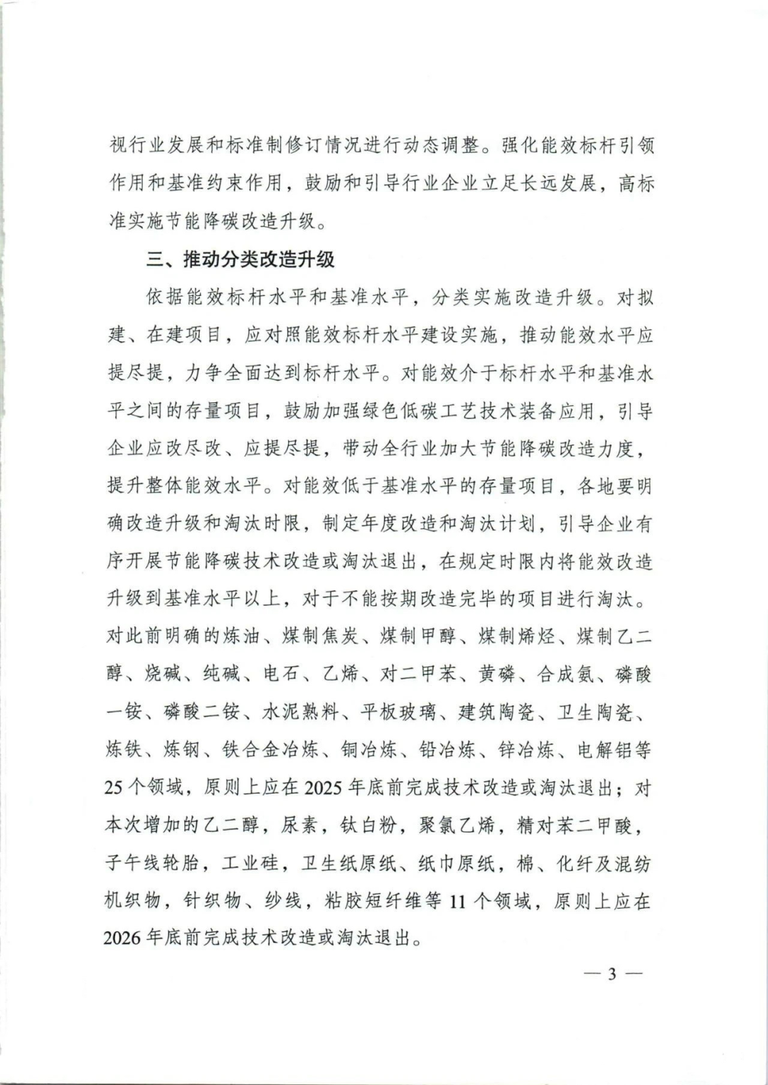 推动分类改造升级依据能效标杆水平和基准水平,分类实施改造升级。对能效低于基准水平的存量项目,各地要明确改造升级和淘汰时限,制定年度改造和淘汰计划,引导企业有序开展节能降碳技术改造或淘汰退出,在规定时限内将能效改造升级到基准水平以上,对于不能按期改造完毕的项目进行淘汰。原则上应在2025年底前完成技术改造或淘汰退出领域:包括水泥熟料、平板玻璃、建筑陶瓷、卫生陶瓷等25个领域。