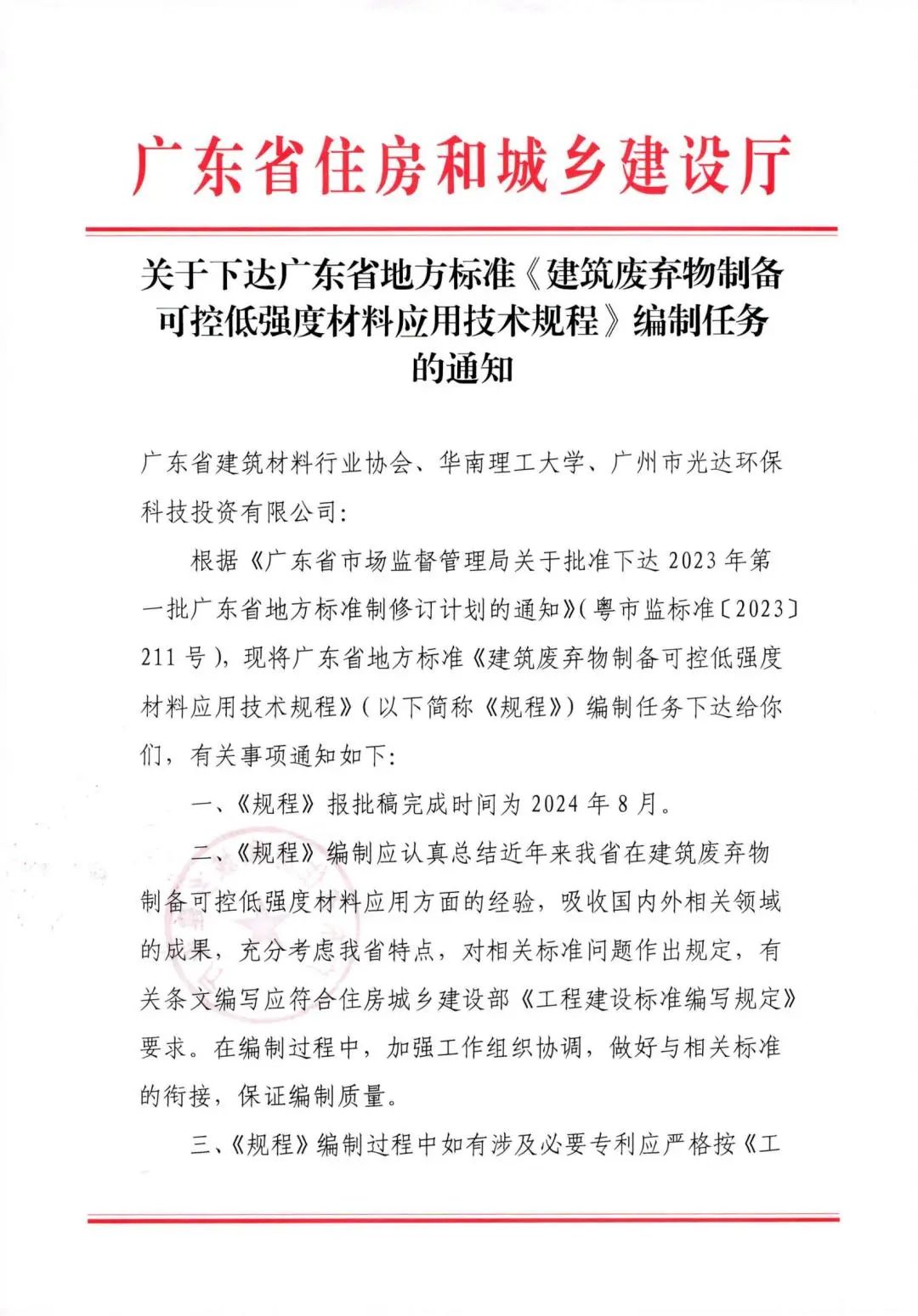 日前,我协会收到广东省住房和城乡建设厅关于下达广东省地方标准《建筑废弃物制备可控低强度材料应用技术规程》编制任务的通知,受住建厅委托组织开展《规程》编制工作。