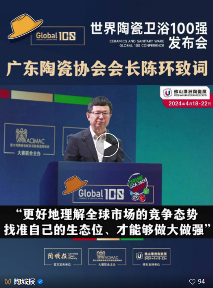 2023年10月11日,陶城报“世界陶瓷卫浴100强(2022财年)发布会暨第11届中国意大利陶瓷大奖赛颁奖盛典”在佛山举行。我协会常务副会长、广东陶瓷协会陈环出席发布会并致辞。