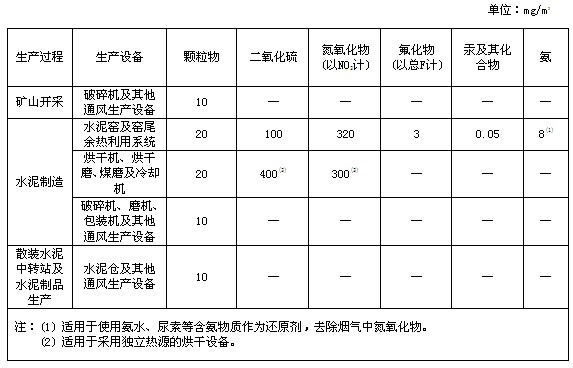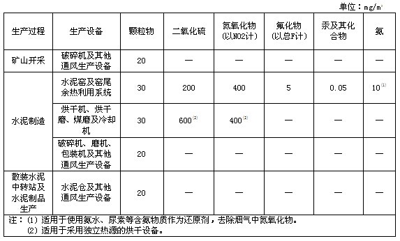 新建水泥企业和现有水泥企业都应分别于2014年3月1日和2015年7月1日实现大气污染物(颗粒物、二氧化硫、氮氧化物、氟化物、汞及其化合物和氨)排放达到表1的限值要求。