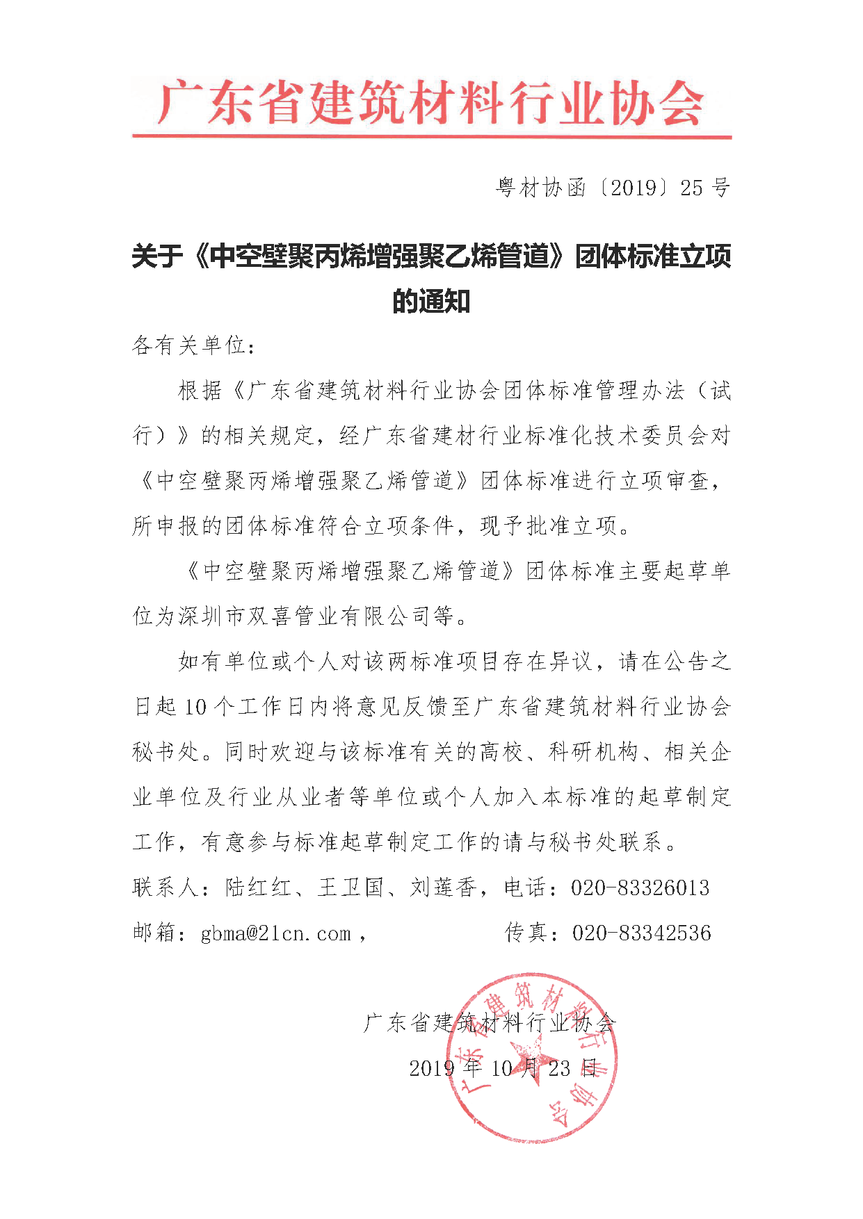 根据《广东省建筑材料行业协会团体标准管理办法(试行)》的相关规定,经广东省建材行业标准化技术委员会对《中空壁聚丙烯增强聚乙烯管道》团体标准进行立项审查,所申报的团体标准符合立项条件,现予批准立项。