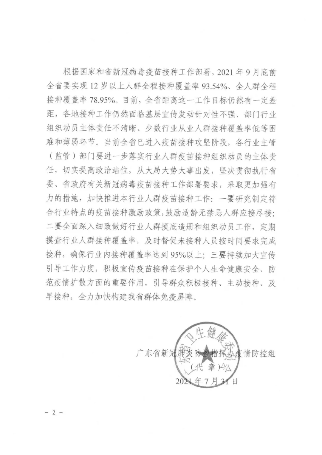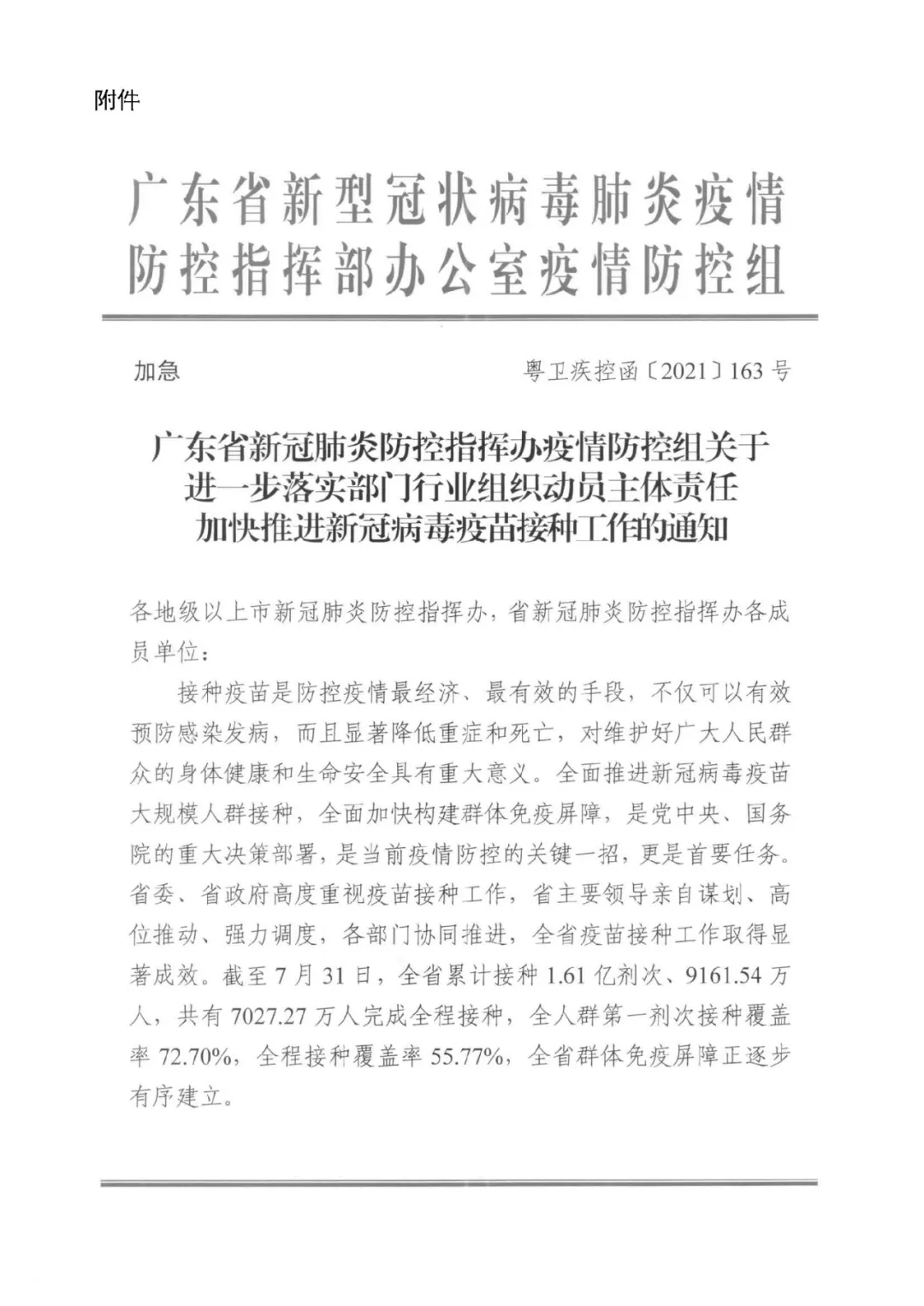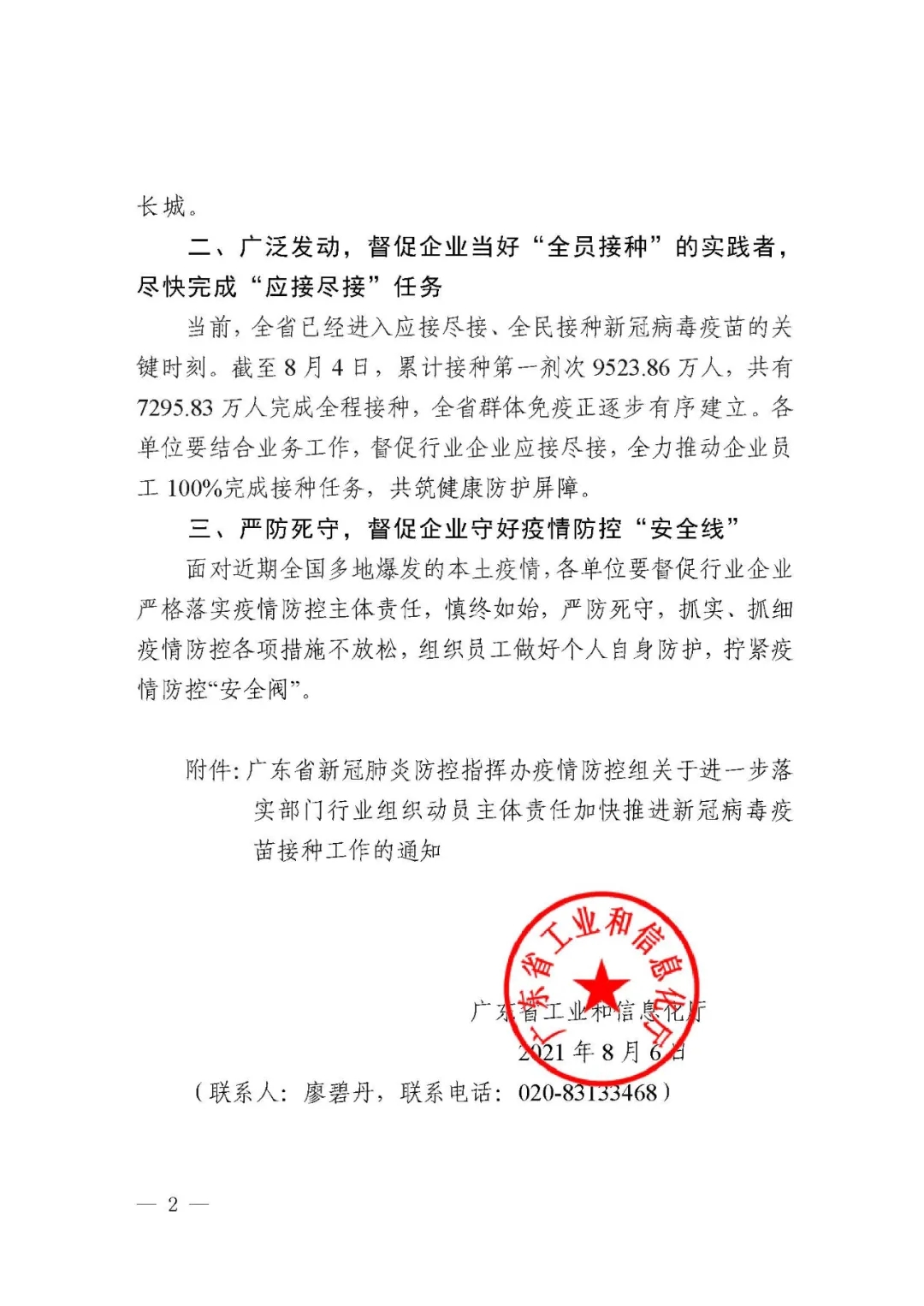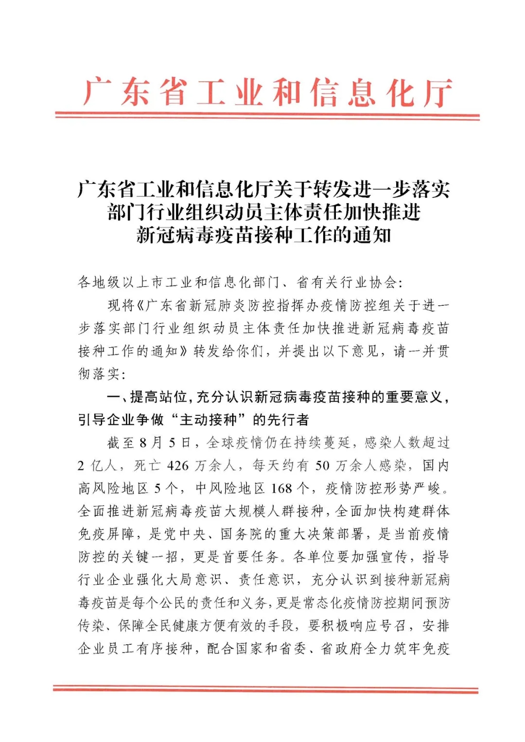日前,广东省工业和信息化厅关于转发进一步落实部门行业组织动员主体责任加快推进新冠病毒疫苗接种工作的通知,并提出具体落实意见,请贯彻落实。