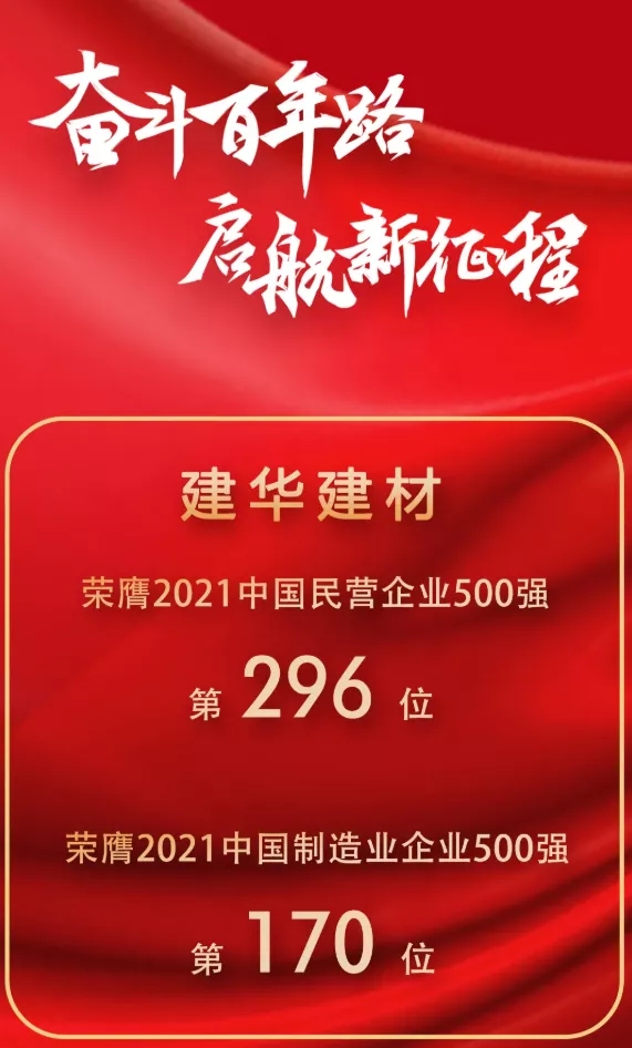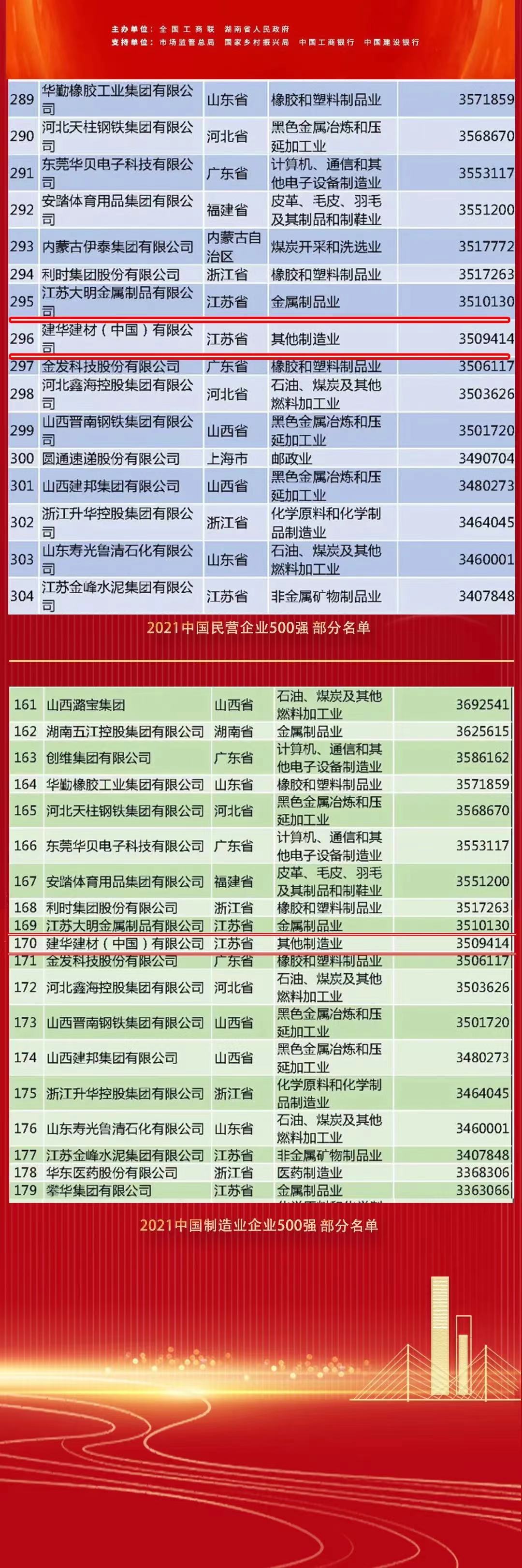 9月25日,由全国工商联、湖南省人民政府共同主办的“2021中国民营企业500强峰会”在长沙举行,峰会分别公布了“2021中国民营企业500强榜单”和“2021中国制造业民营企业500强榜单”,我协会副会长单位建华建材(中国)有限公司再度上榜。协会衷心祝贺建华建材荣登榜单,再创辉煌!!!