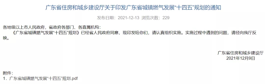 12月13日,广东省住房和城乡建设厅在官网印发了关于《广东省城镇燃气发展“十四五”规划》(以下简称“规划”)的通知,继续大力推动煤改气、油改气、瓶改管和分布式能源,扩大消费;推动城燃企业整合,减少层级,降低中间成本。