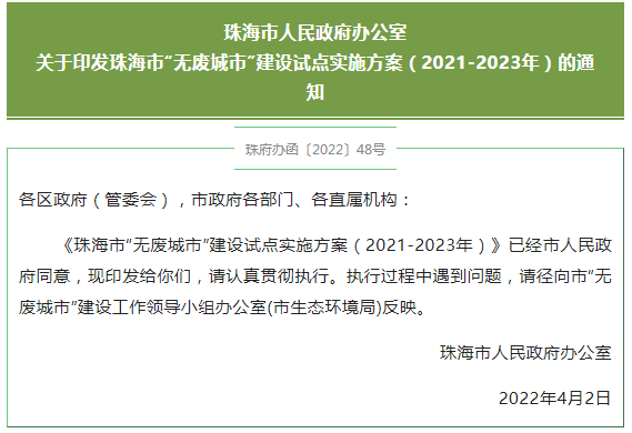日前,珠海市印发《“无废城市”建设试点实施方案》,加快形成绿色发展方式和生活方式,大力推进固体废物减量化、资源化、无害化,促进城市可持续发展和绿色转型。