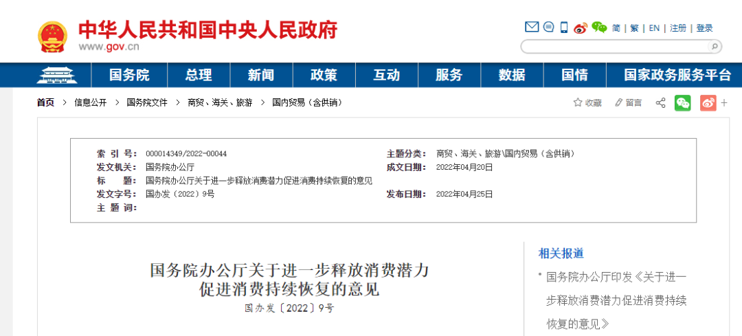 4月25日,国务院办公厅发布关于进一步释放消费潜力促进消费持续恢复的意见,意见围绕“应对疫情影响,促进消费有序恢复发展”、“全面创新提质,着力稳住消费基本盘”、“完善支撑体系,不断增强消费发展综合能力”、“持续深化改革,全力营造安全放心诚信消费环境”、“强化保障措施,进一步夯实消费高质量发展基础”等方面提出释放消费潜力、促进消费持续恢复的具体举措。