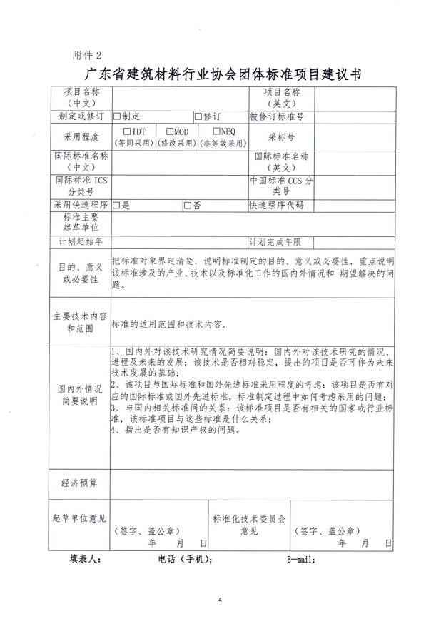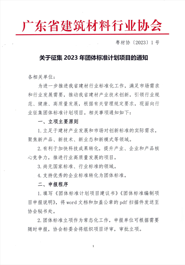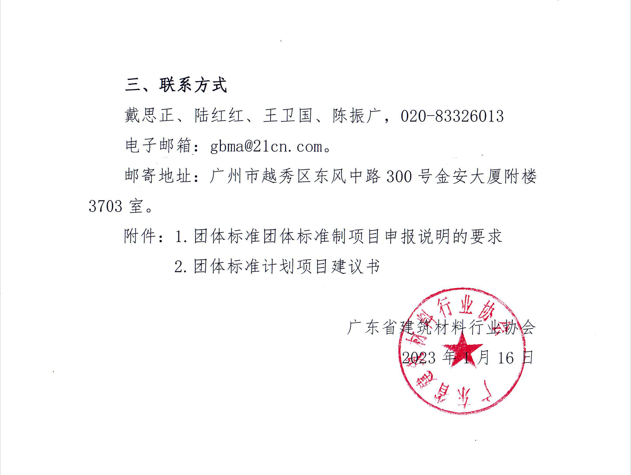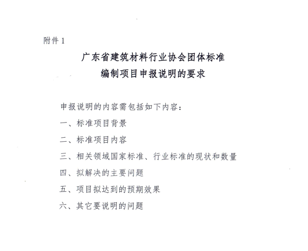 为进一步推进我省建材行业标准化工作,满足市场需求和行业发展需要,推动我省建材产业技术创新,引领行业规范、健康、高质量发展,我协会根据有关管理规定要求,现面向行业征集团体标准计划项目,请有意向申报的单位与我协会联系:020-83326013。