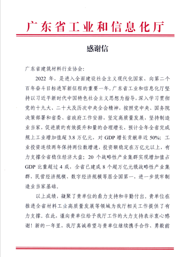 近日,我协会收到广东省工业和信息化厅发来感谢信,信中对协会在推进全省材料工业高质量发展等领域为工信厅提供的有力支撑表示感谢。希望在新的一年里,继续携手合作、勇毅前行,在探索中国式现代化建设的广东实践中书写新篇章、创造新辉煌。