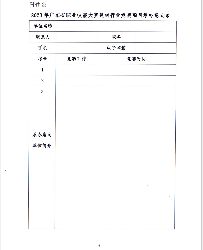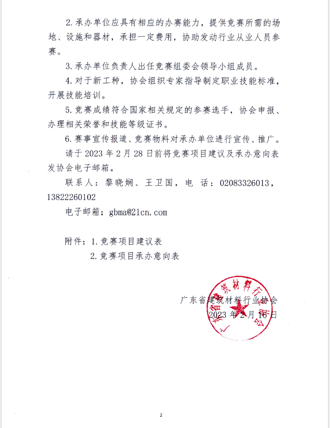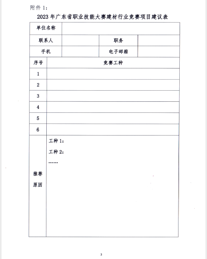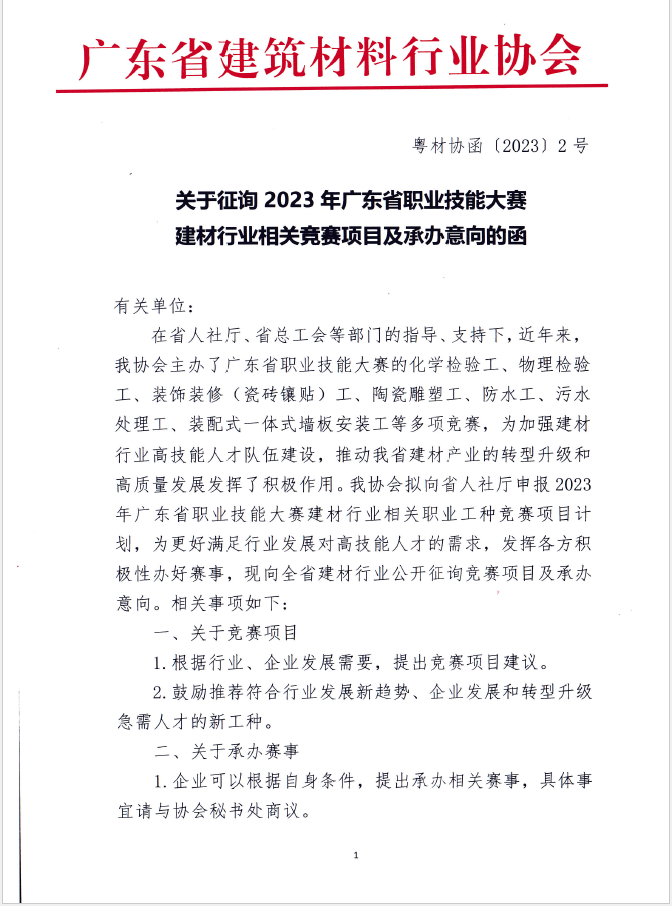 为加强建材行业高技能人才队伍建设,推动我省建材产业的转型升级和高质量发展,我协会面向全省建材行业公开征询竞赛项目及承办意向,敬请申报。联系人:黎晓娴、王卫国,电 话:02083326013,13822260102 。