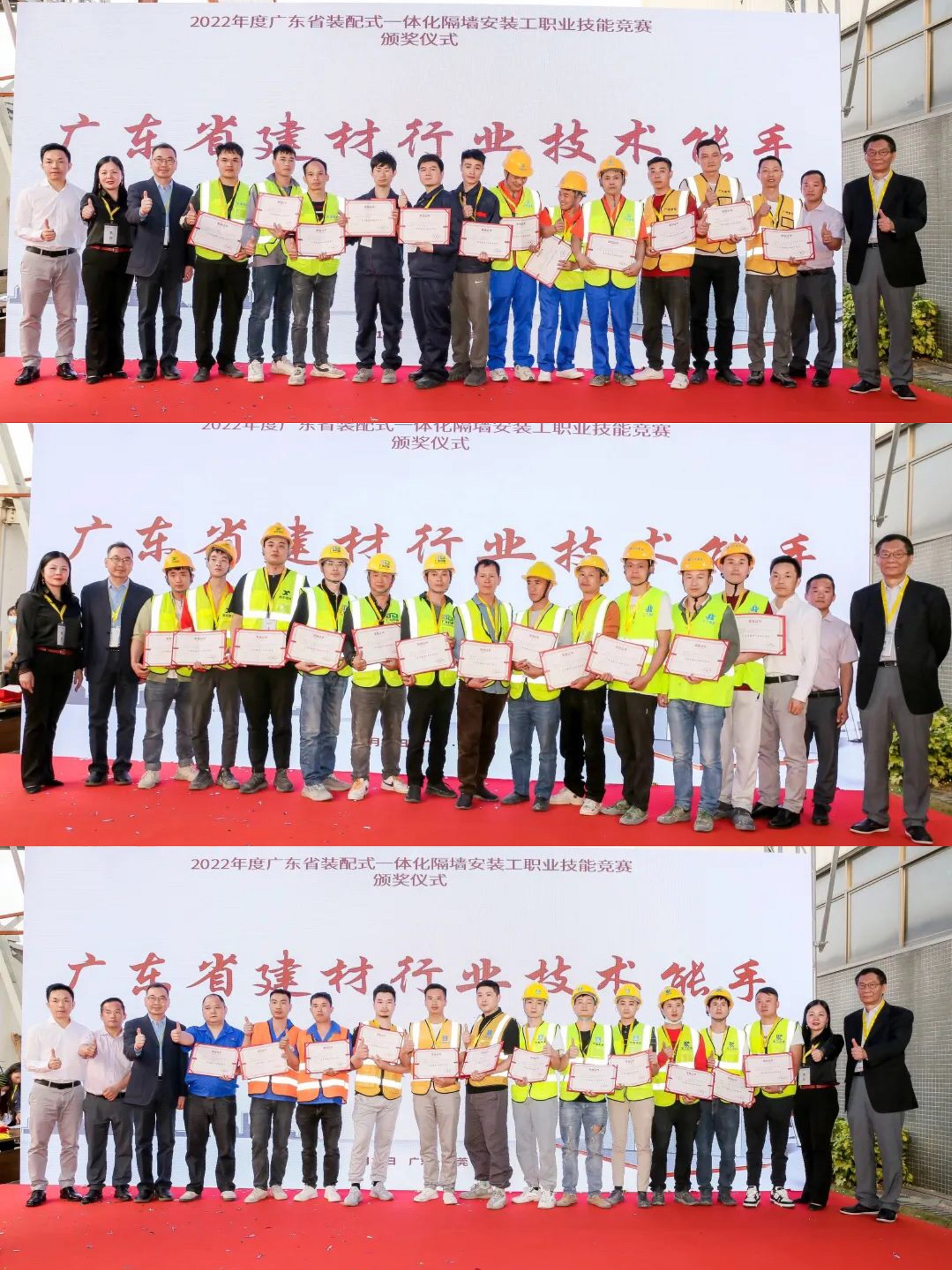 经过激烈的角逐,本次大赛由中建三局集团有限公司广东实验中学永平校区项目部吕波、杨延辉、黄元成,广州珠江装修工程有限公司叶文涛、谭光举、蔡兵夺得一等奖;广州建筑装饰集团有限公司李维波、吕昌华、罗立明,广州安信建筑安装有限公司王成、贾丽新、伍江平,广东杰顺建设工程有限公司张伟、张新、谭进南,中建四局第五建筑工程有限公司曾义、张义银、赵伟获得二等奖;广东君道建筑工程有限公司陈维、郑朝、郭海峰,深圳市江天建筑工程有限公司谢强龙、谢鹏飞、王朋朋,广州立墙墙体材料有限公司陈林乃、陈羽、王海军,广州越发环保科技有限公司王笔艺、王本红、周大双,广东松本绿色新材料科技有限公司韦佳庄、江家友、李伟华,广州市城市建设职业学校刘林、吴显涛、甘文松获得三等奖,获得一、二、三等奖的参赛队的选手,同时获得大赛组委会授予“广东省建材行业技术能手”荣誉称号。现场领导嘉宾们为本次竞赛中获得优异成绩的参赛选手进行了颁奖。
