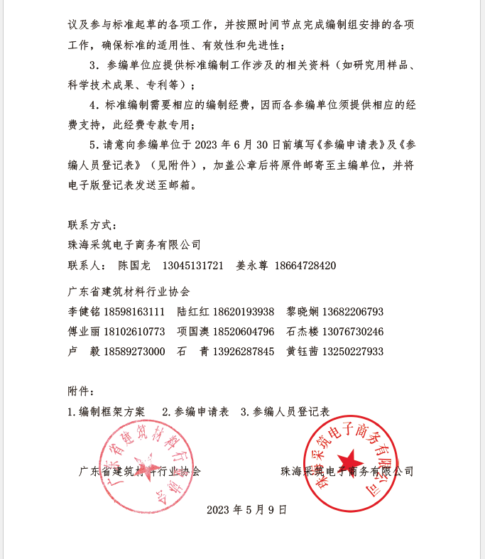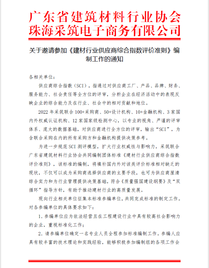 为扩大行业权威性与影响力,进一步规范SCI测评模型,我协会联合采筑共同开展团体标准《建材行业供应商综合指数评价准则》编制工作,以填补国内外对该类评价标准相对缺乏的现状,推动建材行业高质量发展。现向行业相关单位征集本标准参编单位,共同完成标准的制定工作。