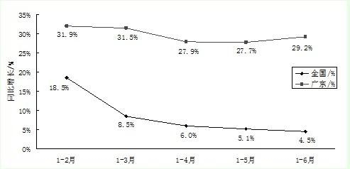 由于国际市场需求继续恢复增长,对建材产品出口拉动增强。上半年,广东省建材工业实现出口交货值同比增加29.2%,增幅较全国平均水平高近25个百分点,同时,今年以来,广东省建材产品出口持续保持了快速增长,见图2所示。