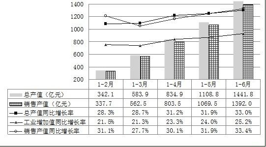 上半年,全省建材工业规模以上企业完成总产值1109亿元,同比增长33.0%; 工业增加值同比增长25.2%,增幅同比提高4.5个百分点;实现销售产值1070亿元,同比增长31.9%,产品销售率96.5%;广东建材行业上半年总产值、工业增加率增长率变化如图1所示,可以看出,今年以来,全省建材工业总产值、销售产值、工业增长值连续保持20%以上的快速增长。