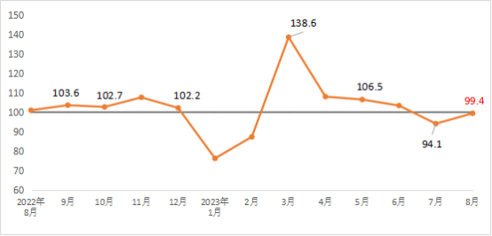 2023年8月份建筑材料工业景气指数为99.4点,较上月回升5.3点,接近临界点,建筑材料工业经济运行减弱趋势有所放缓,但仍处于非景气区间。