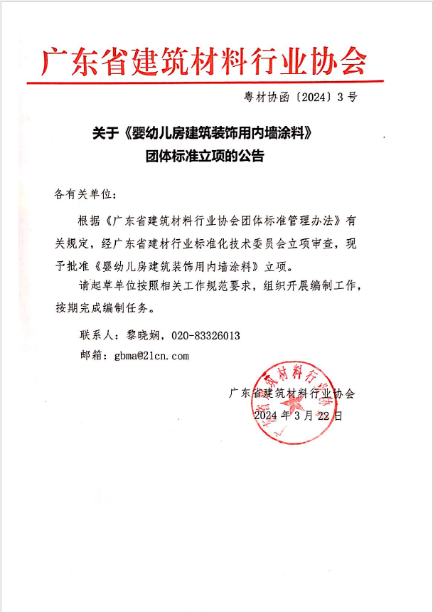关于《婴幼儿房建筑装饰用内墙涂料》团体标准立项的公告