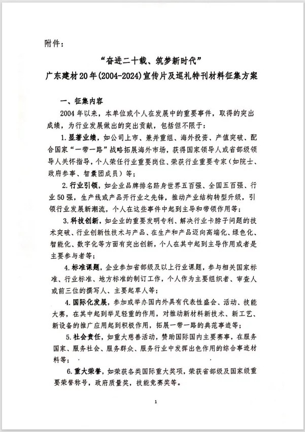 现向全行业征集具有代表性,能够反映过去20年广东建材行业发展的重要事件、重要活动、重要人物、重要成果等材料,相关材料经评审编入宣传片或特刊中。