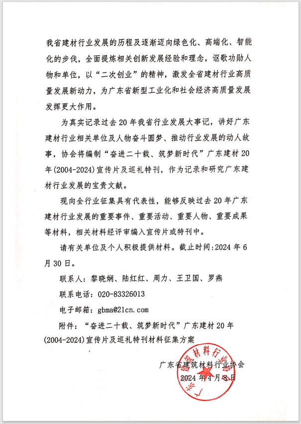 关于征集广东建材20年(2004-2024)行业发展典型事迹相关材料的通知