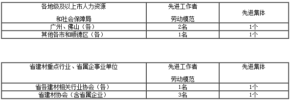(三)我省全国建材行业先进集体、先进工作者和劳动模范的推荐工作实行归口推荐:各地级及以上市由各市人力资源和社会保障局商市经信主管部门并征求建材行业协会意见,提出推荐提名对象;省建材行业协会和省建材各相关行业协会也可推荐提名对象。全省提名推荐名额见下表: