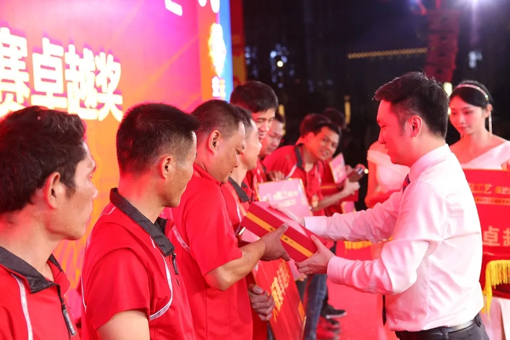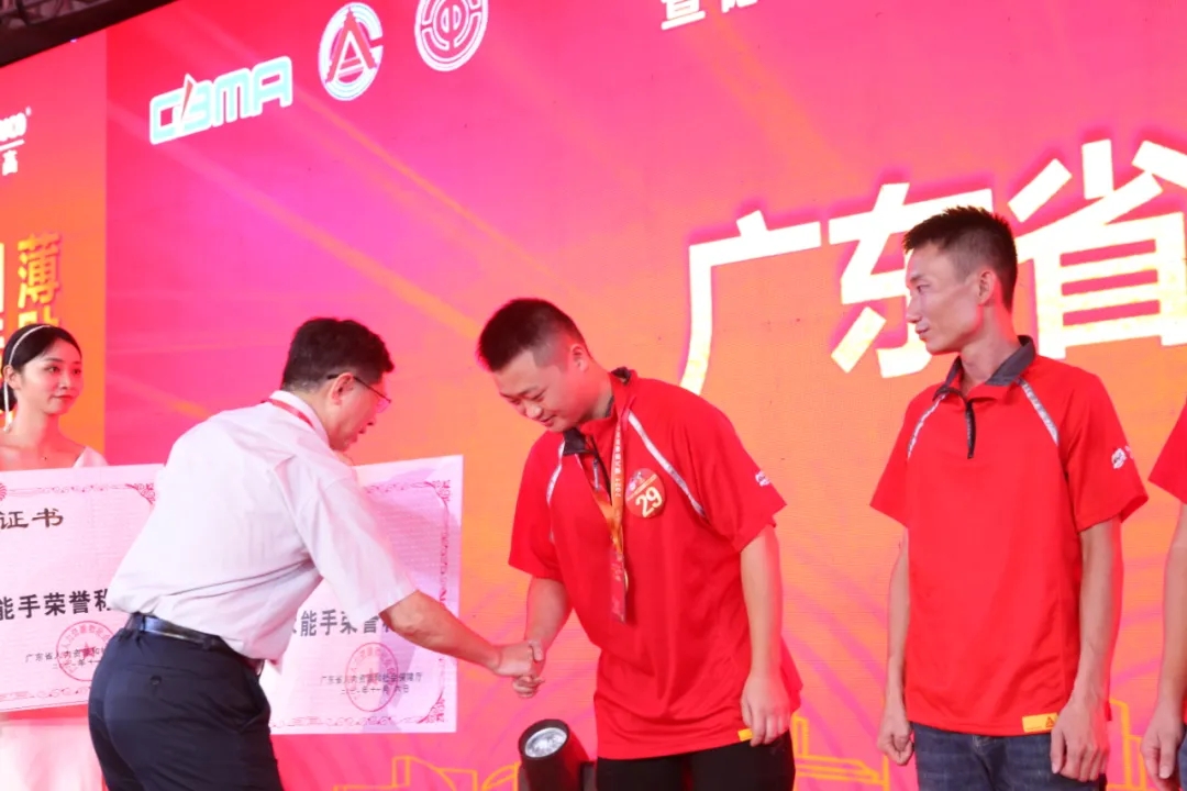 首席专家吴一岳宣布开赛经过激烈的角逐,本次竞赛产生了一批优秀的技艺能手,雷雨、吴立彬和黄俊龙荣获本次竞赛的冠军、亚军和季军称号,吴雨、吴立彬、余宏峰、黄俊龙、王海峰、吴金辉、郑显森、邹云等8人获得了“广东省建材行业技术能手”奖项称号,雷雨、吴立彬、余宏峰等3人符合条件向省人社厅申报“广东省技术能手”称号,王海峰荣获“个人比赛最佳手艺奖”奖项,现场领导嘉宾们为本次竞赛中获得优异成绩的参赛选手进行了颁奖。颁奖现场