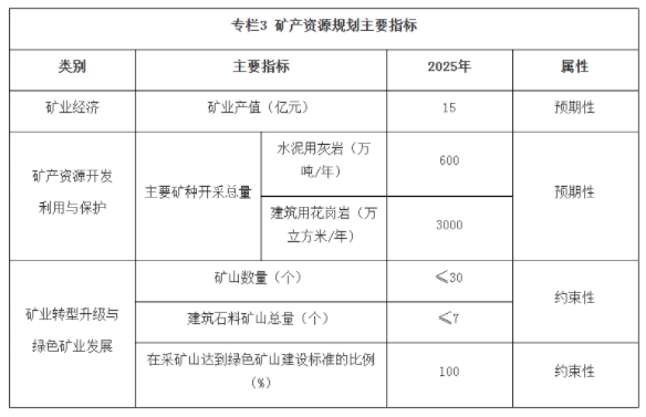 《规划》严格限制建筑用花岗岩和水泥用灰岩开采,明确全市采矿权数量控制在30个以内,其中建筑石料采矿权不超过7个,水泥用灰岩与建筑用花岗岩的年开采总量分别可达600万吨/年与3000万方/年。到2025年,广州矿业产值达15亿元。