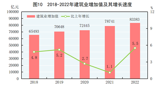 全年建筑业增加值83383亿元,比上年增长5.5%。全国具有资质等级的总承包和专业承包建筑业企业利润8369亿元,比上年下降1.2%,其中国有控股企业3922亿元,增长8.4%。